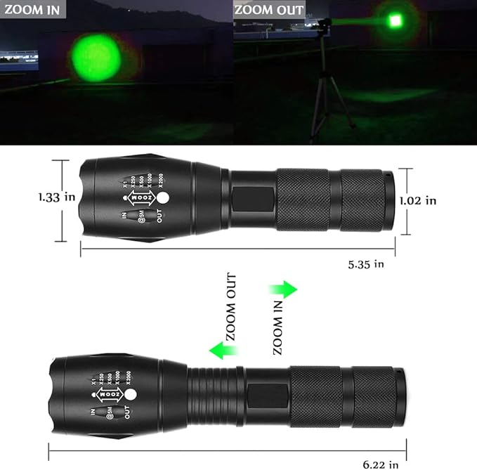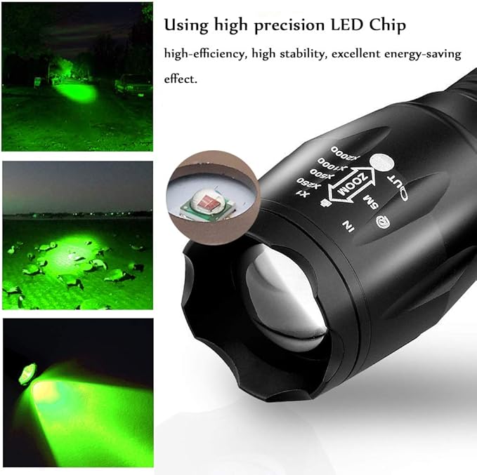 Green LED Flashlight Single Mode Hunting Light with Zoomable and Waterproof for Hunting Predator Fishing