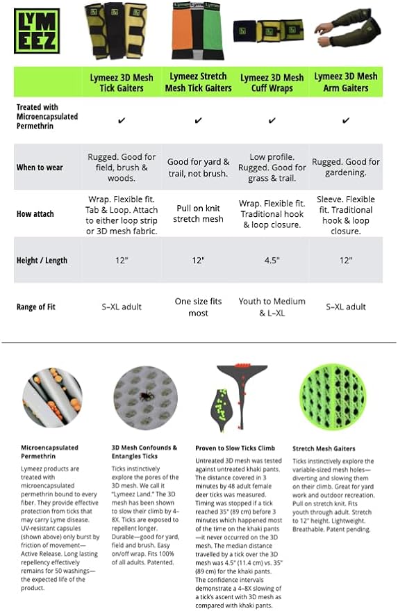 - LYMEEZ 3D MESH CUFF WRAPS confound and repel ticks. Ticks don’t fly or jump! Most ticks climb on from grass and leaf litter. Ticks instinctively explore 3D mesh—proven to slow their climb by 4-8X—exposing them to repellent for longer. (See 20 second video.) Effective protection from ticks that may carry Lyme disease. Repellent releases gradually through friction of use. Microcapsules resistant to degrading in UV light. Use in conjunction with other repellents on other body areas.