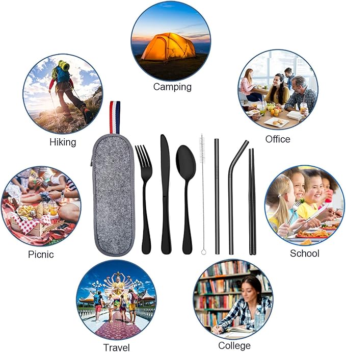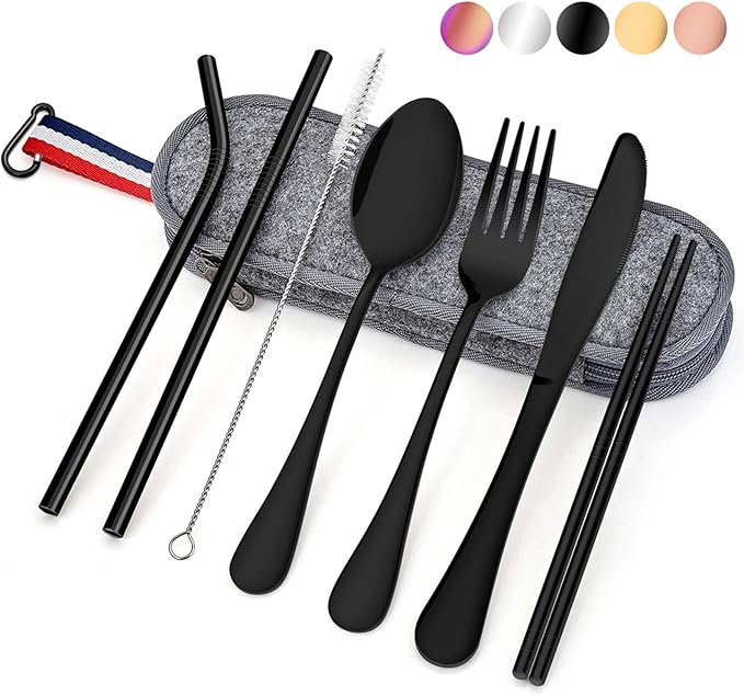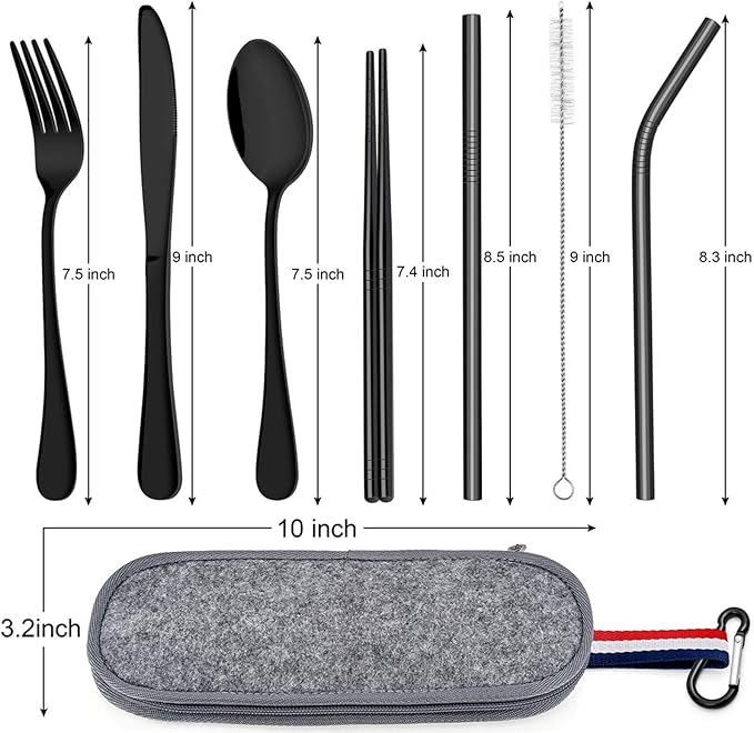 - FULL SIZE TRAVEL UTENSIL SET - Includes Dinner Knife, Dinner Fork, Dinner Spoon, Straight Straw, Bent Straw, Chopsticks, Cleaning Brush and Carrying Case, Elevating your dining experience when camping, traveling, at picnic, at work, at school, etc.