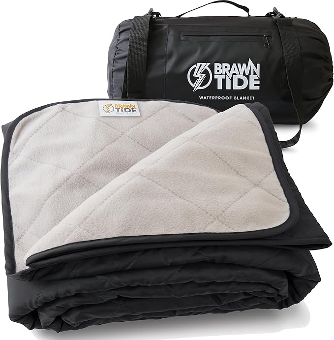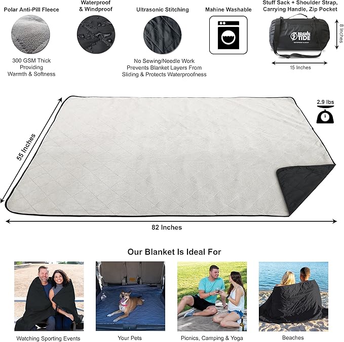 BRAWNTIDE Large Outdoor Waterproof Blanket - Quilted, Extra Thick Fleece, Warm, Windproof, Sandproof, Includes Stuff Sack, Shoulder Strap, Ideal for Beaches, Picnics, Camping, Stadiums, Dogs, Car