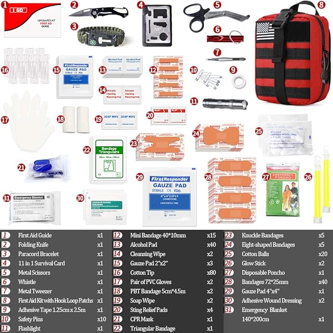- ✔【A Must-Have 251 Pieces First Aid Survival Kit】: Contains of 9 pieces practical survival gear, 238 pieces essential first aid supplies, 2 piece velcro patches and 4 in 1 military MOLLE pouch to get you well-prepared in emergency situations