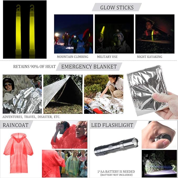 - ✔【9 Pieces Practical Survival Gear】Includes 9 pieces practical survival tools: emergency blanket, glow stick, LED flashlight, paracord bracelet compass, whistle, 11 in 1 survival card, disposable poncho, etc, can meet your different needs in hiking, camping, cycling, backpacking, sports or travel