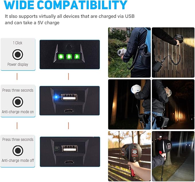 - Good compatibility. This portable battery can fit every spotlights which are also charged via USB. It also can charge most devices that use USB with 5V charge, even smartphones