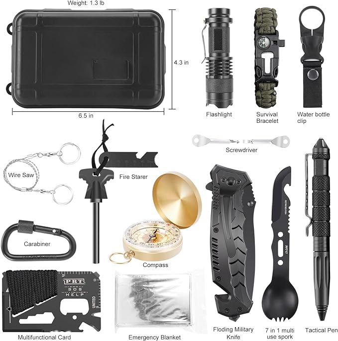 - 【Premium & Durable】Tactical flashlight, tactical pen, bracelet, compass, tactical knife, etc., are made of high-quality material, providing excellent safety and durability, meeting emergency and medical needs, making your camping, wilderness survival or hiking trips easier and more convenient, without worrying about getting lost