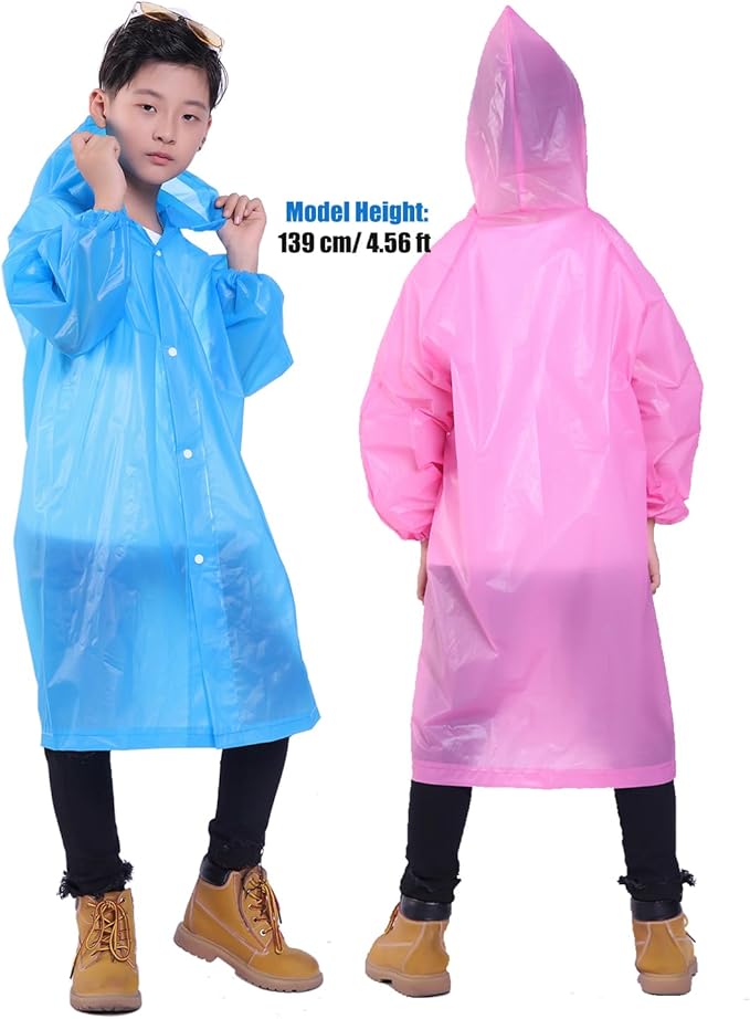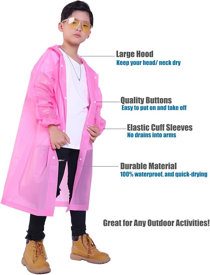 - Compact Emergency Protection: Our raincoat for girls and boys features a large hood, long sleeves, elastic cuffs, and snap buttons to keep you cool and dry in heavy rain. Easy to put on or take off, and fold for reuse. It saves space and reducing waste