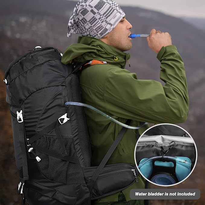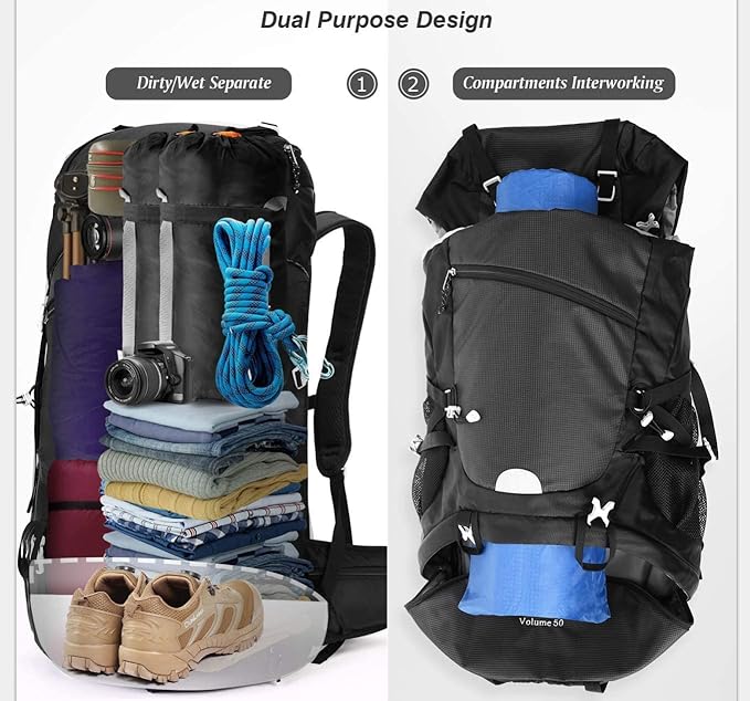 - [Innovative Features of Hiking Backpack] - The large U-shaped 2-way zipper opening and bottom opening allow you to quickly access the main compartment of the backpack. The backpack can be divided into upper and lower sections. The bottom section has wet/dry compartments to separate different gear. There is a hook in the main compartment designed for placing hydration bladder to keep you hydrated for a day (hydration bladder is NOT INCLUDED).