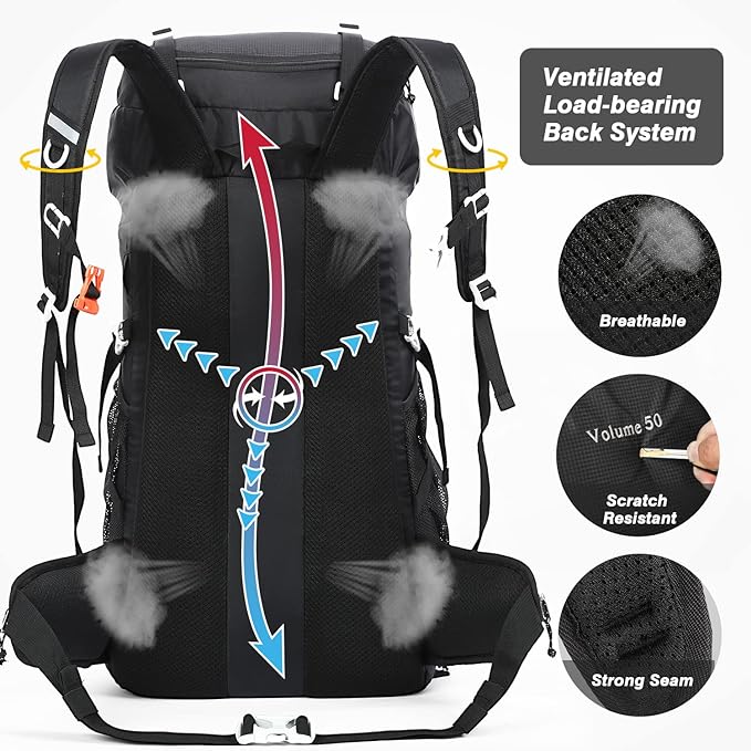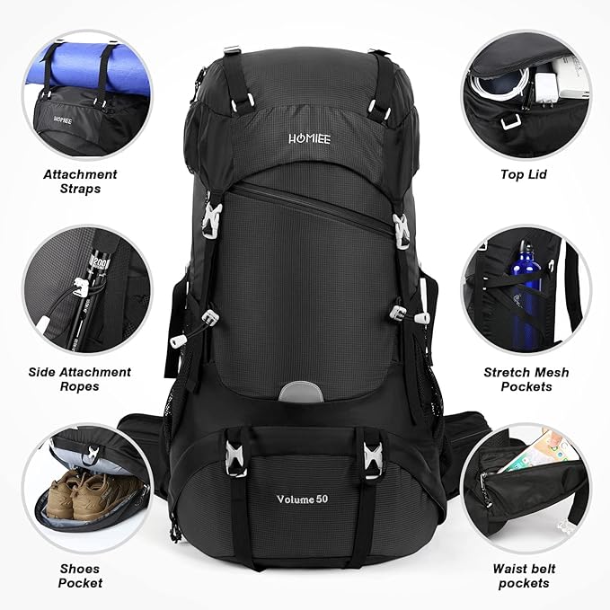- [Be an Ultralight Backpacker Now] - The HOMIEE 50L hiking backpack weighs only 1.8 pounds and is designed for minimalist hikers with premium durability and comfort. This travel backpack uses high-quality YKK zippers for extra smoothness, the durable 420D waterproof nylon fabric can prevent tearing and abrasion caused by prolonged use. An ideal pack for anyone on a 3-5 day adventure, from beginners to group leaders to veteran thru-hikers! The size of this pack is airline-approved.