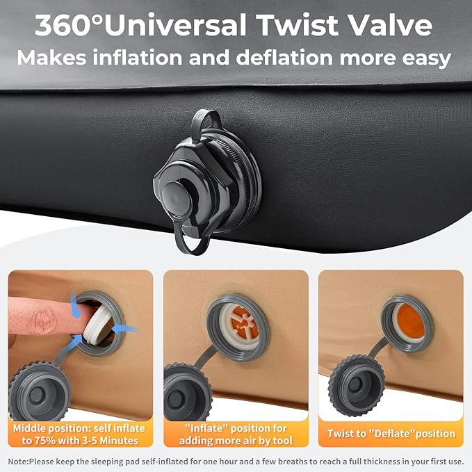 - 【FAST & EASY SELF INFLATING】High qualified rotating Boston valves Fitted, makes inflation and deflation quick and easy. Just twist the valves to open and camping mattress begins to fill itself. This camping mat will completely inflate in a minute. Add a few breathes to top it off to your desire firmness. Save your breath after a long day on the trail.