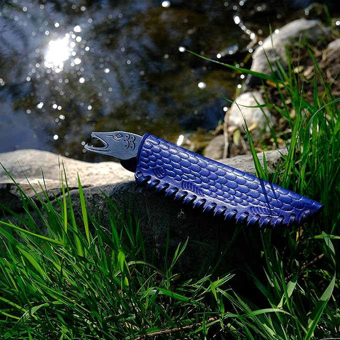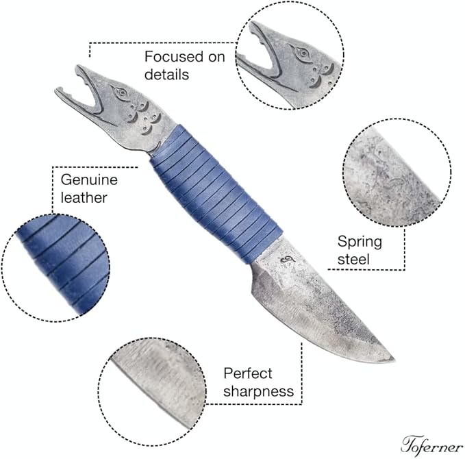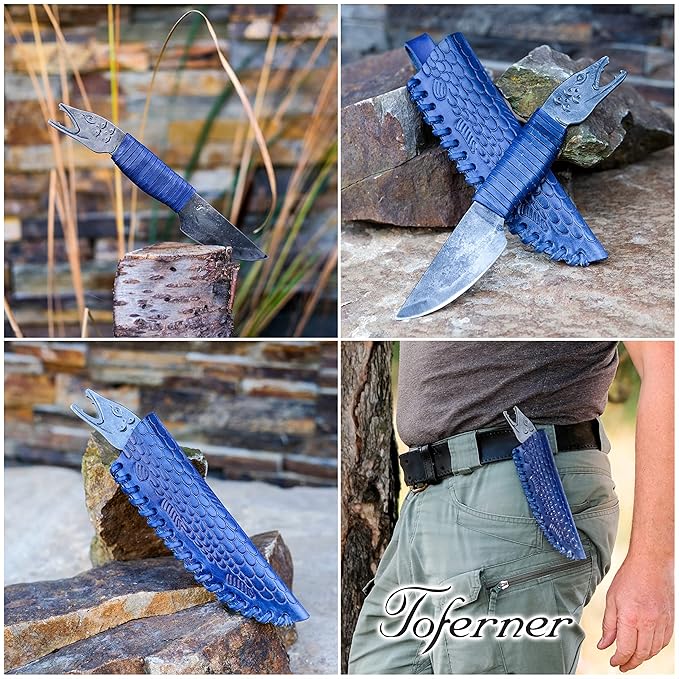 Toferner Hand Forged Knife Fish Head with Sheath, Vintage Knife for Antique Collection, Genuine Leather Case, Hardened Blade, Hand Made Craft, Gift Idea for Men (Blue)