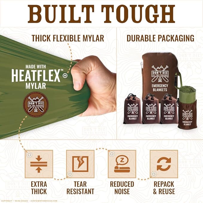 - TOUGHEST EMERGENCY BLANKETS ON EARTH – Exclusively from Don’t Die In The Woods, our HeatFlex mylar is thicker and more flexible than ordinary space blankets. Combined with durable packaging designed ultralight & compact for outdoor adventures, you won’t find tougher mylar emergency blankets anywhere.