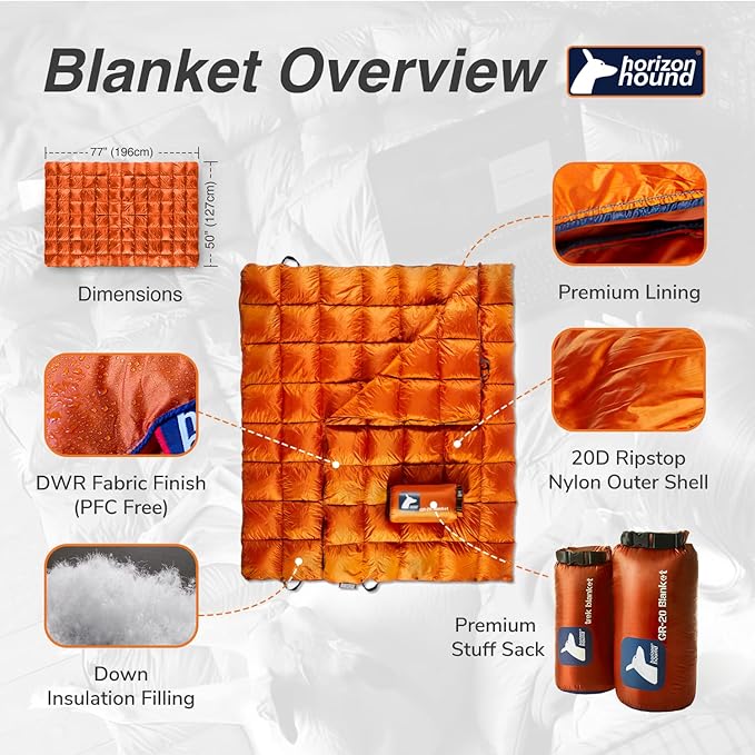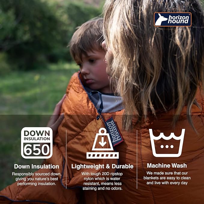 Horizon Hound Down Camping Blanket - Outdoor Travel Blanket | Sustainable Insulated Down | Lightweight & Warm Quilt for Camping, Stadium, Hiking & Festival | Water Resistant, Packable & Compact