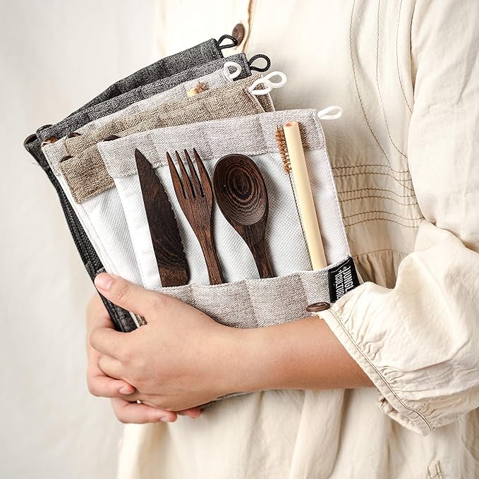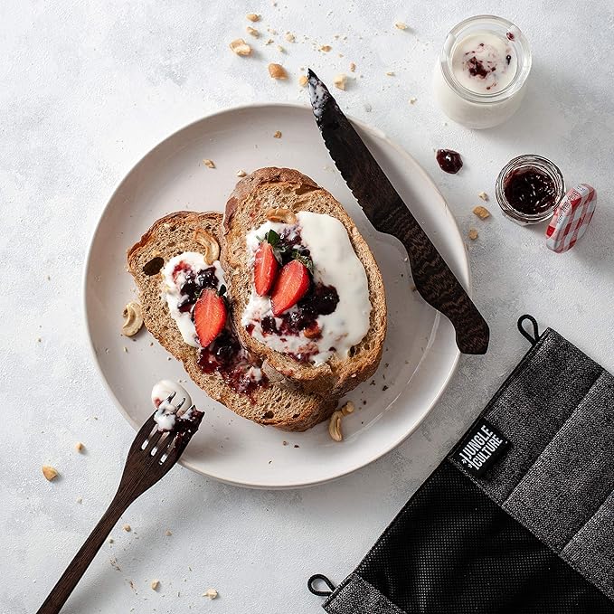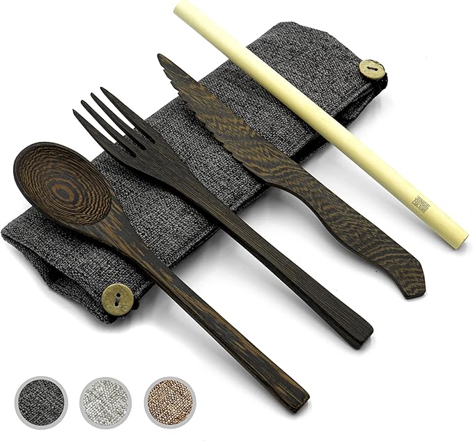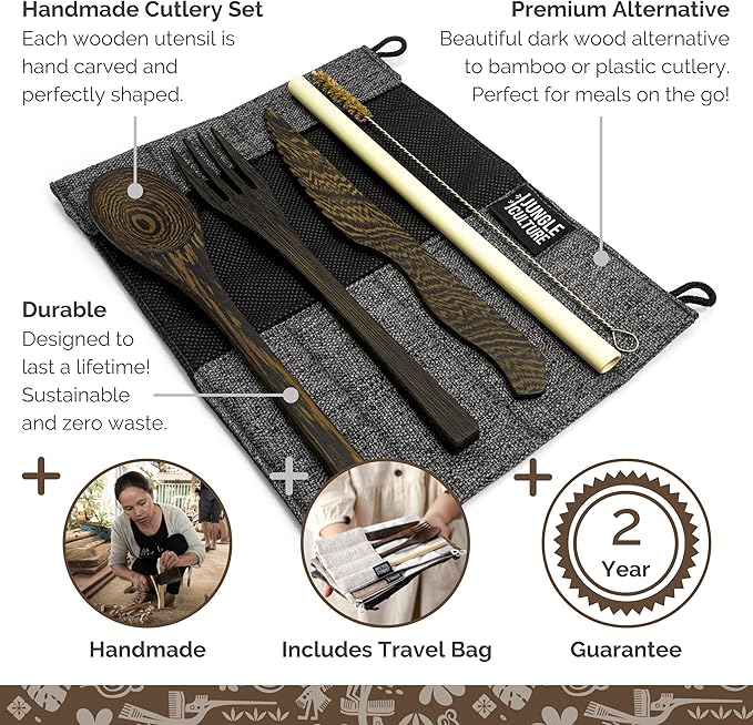 Jungle Culture® Premium Wooden Travel Utensils • Knife, Fork, Spoon, Straw, Case • Eco Friendly Alternative to Bamboo Cutlery • Coconut Bowls Zero Waste Reusable Flatware • Portable Camping Picnic Set