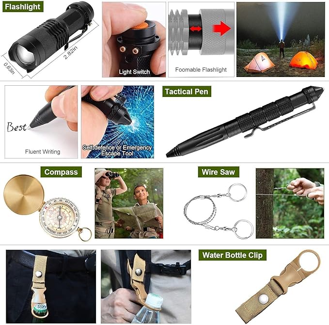 - Premium & Durable, flashlight, pen, bracelet, compass, whistle, fishing equipment set, etc.