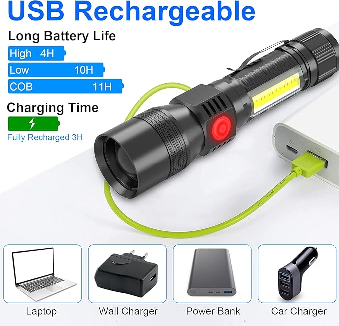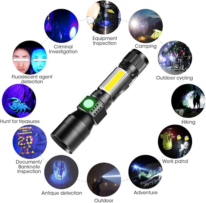 - 【7 Modes & One Key Turn Off】The rechargeable flashlight has every feature you could possibly need, including 7 lighting modes: High / Low / Strobe / UV light / COB white light / COB red light / COB side strobe light mode and wide-to-narrow beam twistable zoom. Long press for two seconds to turn off the light in any mode.