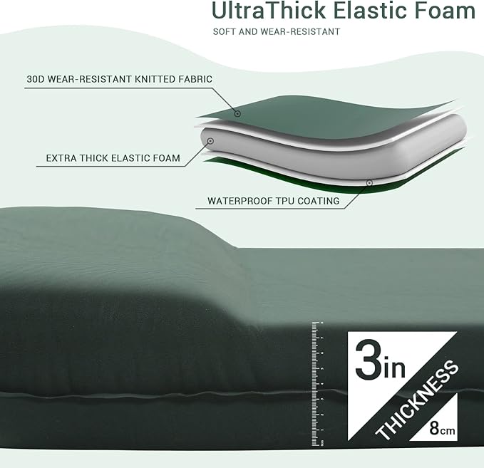 - SUPER TOUGH FABRIC: 3.15-inch thickness FlexFoam and outdoor-grade tear-resistant fabric provide your body with the most comfortable and stable sleep, no longer worry about the stones and branches underground will damage the air cushion. Used only for the strongest camping equipment. Provides a good balance between comfort and durability. It is Virtually SILENT, WATERPROOF, No more crinkly or squeaky noise, your perfect pad for using in your tent, sleeping bag, or any floor or hard surface;
