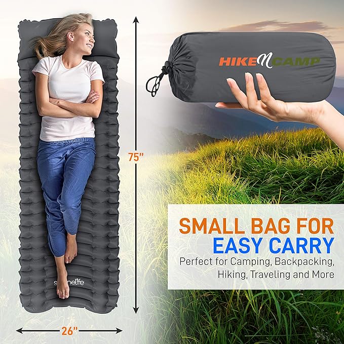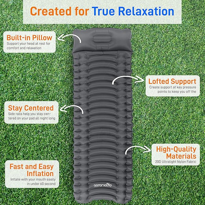 - COMPACT & LIGHTWEIGHT: Serenelife air mattress inflatable sleeping pad for camping weighs only 1.21 lbs & packs down to the size of a thin water bottle & doesn’t take up much space. Ideal backpacking sleeping pad for couples, family, adults, teens