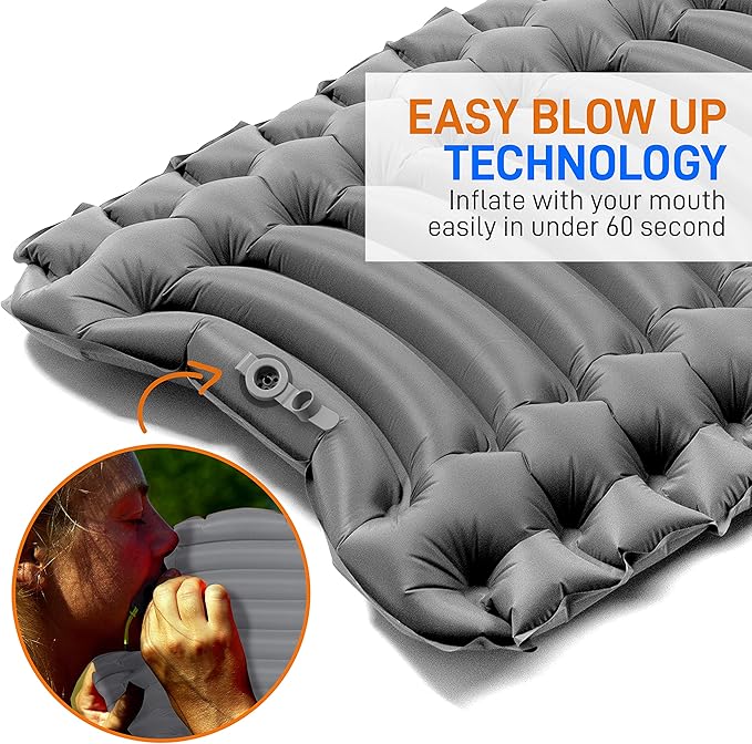- QUICK INFLATING: Just lay this camping air pad backpacking mat flat on the ground, open the gas nozzle and it is super easy to blow up and it does not take a lot of strength. Just tighten the gas nozzle when inflation is complete. No air pump needed