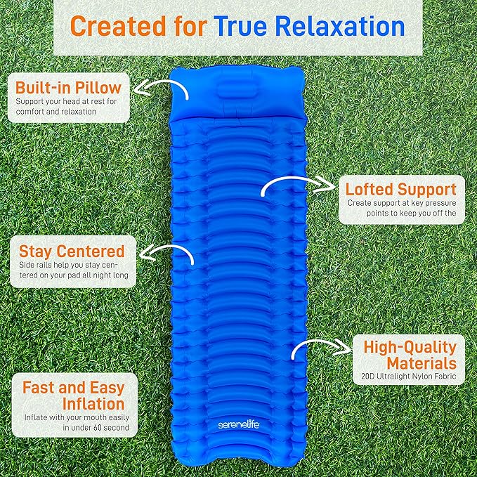 - COMPACT & LIGHTWEIGHT: Serenelife air mattress inflatable sleeping pad for camping weighs only 1.21 lbs & packs down to the size of a thin water bottle & doesn’t take up much space. Ideal backpacking sleeping pad for couples, family, adults, teens