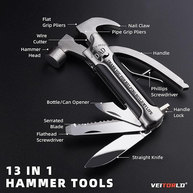 - Heavy-Duty Survival Tool: This multifunctional hammer combines 11 reliable tools into one, all made of quality stainless steel. Whether you need to hammer, cut, tighten, or fix things, this small gift gadget for men will help you get the job done with ease and efficiency. It's an excellent choice for dads who seem to have everything.