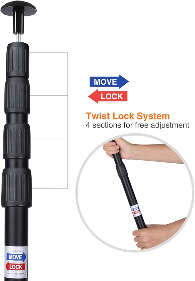 - Twist Lock Mechanism: Simple twist lock system makes it easy to set-up/break-down. Just stretch it to the proper length and rotate to the right and tighten it, or shrink to the shortest length for easy storage when not in use