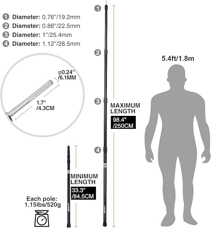 - Adjustable & Lightweight: Large adjustment range from 33.3in/84.5cm to 98.4in/250cm with 4 sections. Each pole weighs only 1.15lbs/520g, can be taken anywhere you want