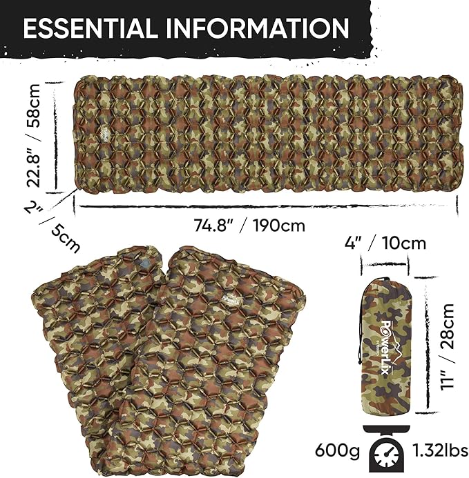- REJUVENATE YOUR BODY: Powerlix camping pad has revolutionary hexagon design made with body mapping technology. The hexagon air cells ergonomically support all of your pressure points, giving you superior support and comfort all night long, no matter how you sleep! The sleeping mat is also a camping gear must haves luxury, being comfortable yet lightweight. It rolls up small, making it effortless to carry around. The cot comes in a variety of color choices, sure to match anyone's personality.