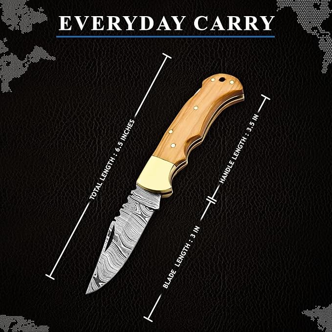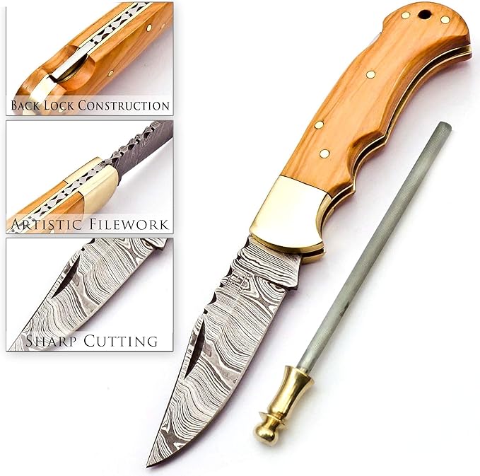 - Multi Purpose: Say goodbye to rusty dull knife. This damascus steel knife has razor-sharp blade with lock back mechanism, exceptionally stringent to tackle variety of stressful tasks. Camping, hiking, fishing, survival, wood cutting, daily cutting activities all can be done smoothly in a quick hand move