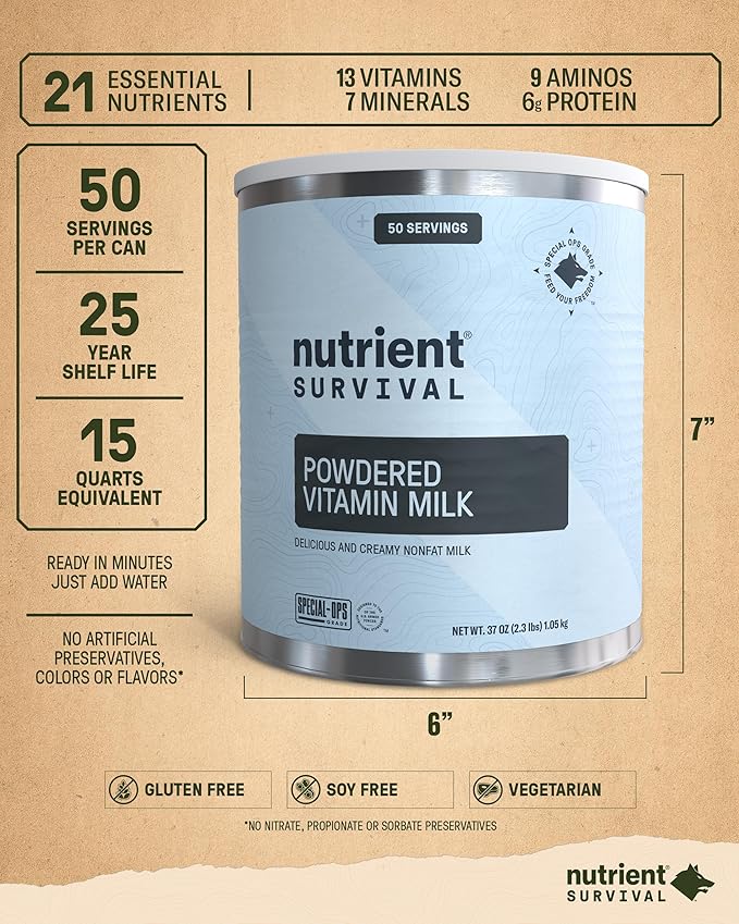 - SPECIAL OPS GRADE NUTRITION: Our soy & gluten-free non-fat dry milk powder is packed with 21 nutrients in each serving. The powdered milk includes 13 essential vitamins, 7 minerals & 6g protein and is a staple survival food for every prepper’s pantry