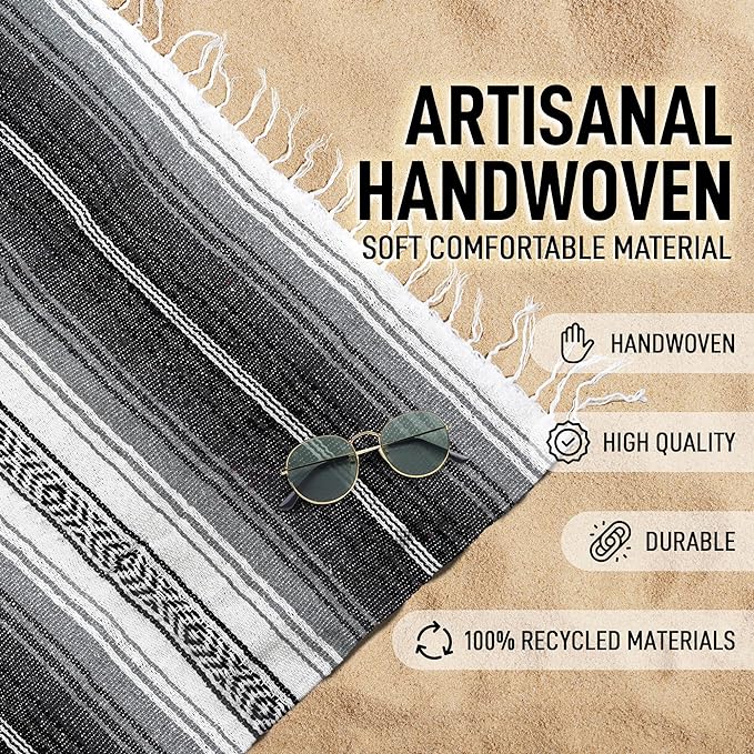 Authentic Extra Large Mexican Blanket (70"x50") - Handwoven Yoga Blanket, Serape Blanket - Artisanal Falsa Blanket, Beach Blanket, Camping Blanket, Picnic Blanket, Outdoor Blanket (Gray)