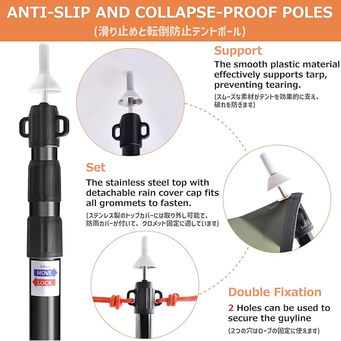 - ☘️ ANTI-SLIP DESIGN: Removable silicone tip cover eliminates punctures and reduces slipping when used directly to support the center of a tarp, can be stable to support the tarp, tents, campers, sun shelter etc
