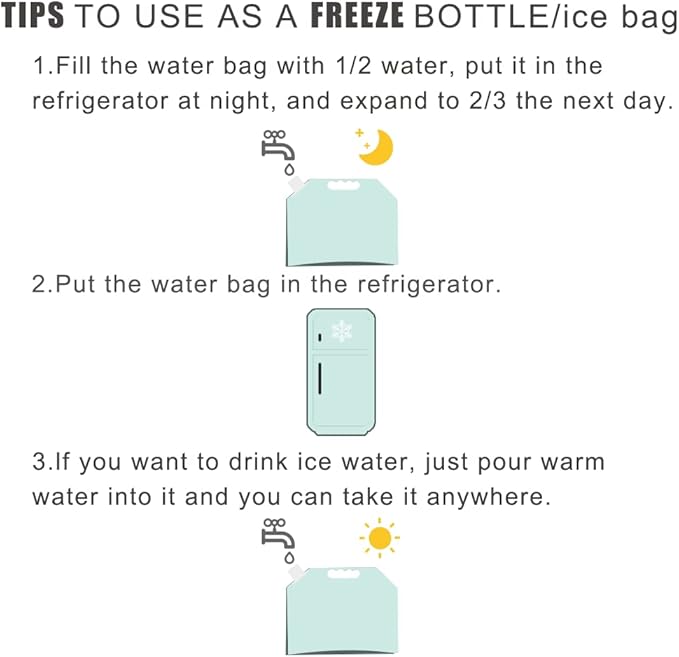 - FREEZABLE & MULTIPURPOSE Freezer safe (great ice bag). Suitable for both indoor & outdoor uses. Great for camping, hiking, backpack, fishing, sports events, and parties. Great for survival & emergency kits. Store water, milk, tea, juice, alcoholic drinks, etc. Also dry goods like beans, grains, and coffee.