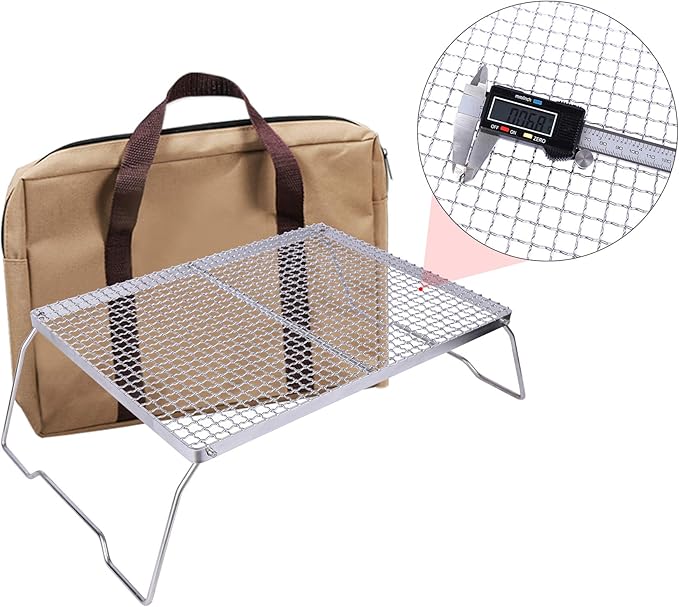 - Foldable Design: The fire grill’s legs can angle out for stability and help to take the weight. In addition to foldable legs, it can also be folded in half from the middle. The campfire grill grate with a storage bag is essential gear for camping, backpacking, hiking, and more.