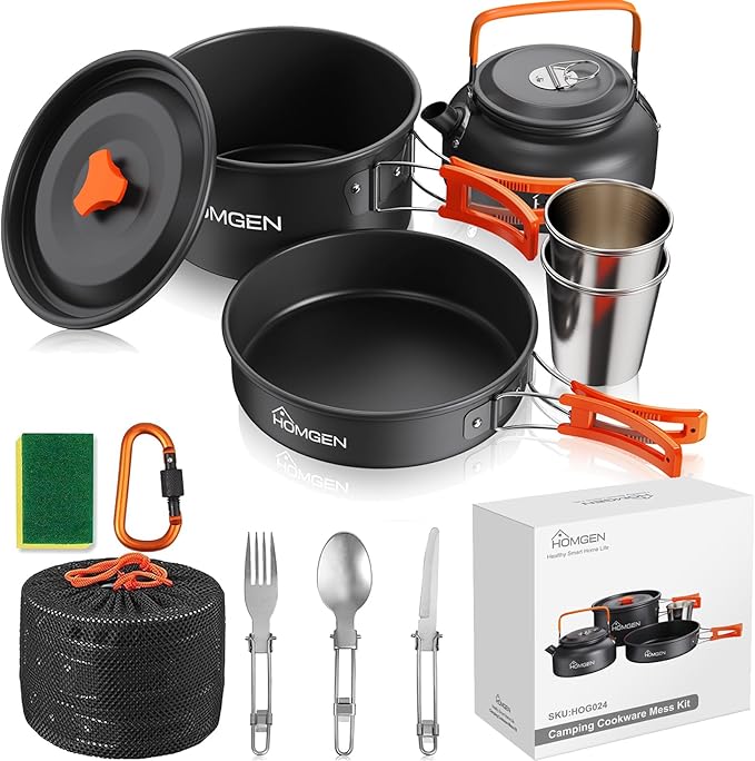 - *๐๐ข๐๐๐ฅ๐ฒ ๐๐ฉ๐ฉ๐ฅ๐ข๐๐๐ญ๐ข๐จ๐ง*-----: Our HOMGEN Family Camping Cook Set With a Pot, A Frying Pan, A Teapot, A Set Meal (A Scoop, A Fork, A Cutter), A Cutlery Bag, A Storage Bag and 2 Stainless Steel Cup. This item is Very Suitable for Outdoor Camping, Hiking, Hunting, Picnics and other Outdoor Activities. Enjoy your Time with Family.