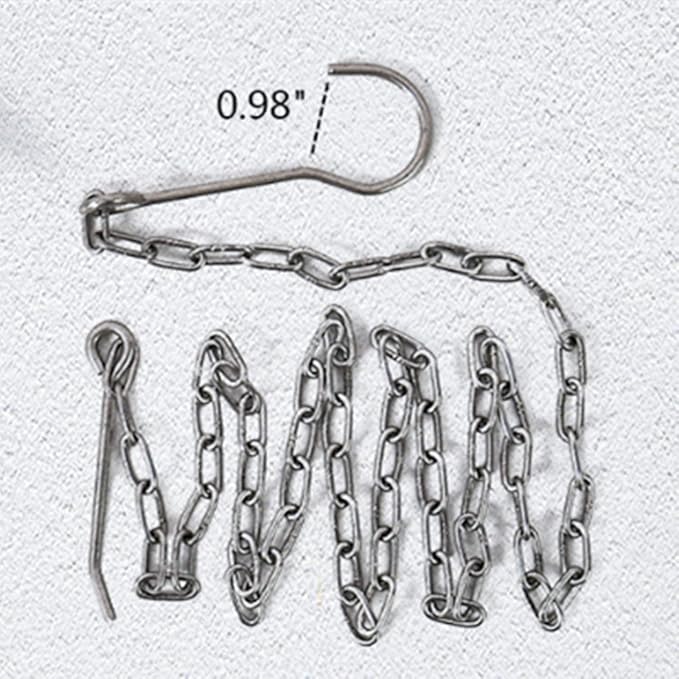 - The new product in 2020, the hook consists of two parts, namely the hook chain and the 3-hole fixing plate. The hook is made of stainless steel and weighs about 148 grams. The length of the chain is 46.45 inches, the diameter of the large hole is 0.78 inches, and the diameter of the small hole is 0.39 inches. The hook bag is made of synthetic cowhide material and copper buttons. The sturdy synthetic cowhide bag can protect the hook and fixed plate well