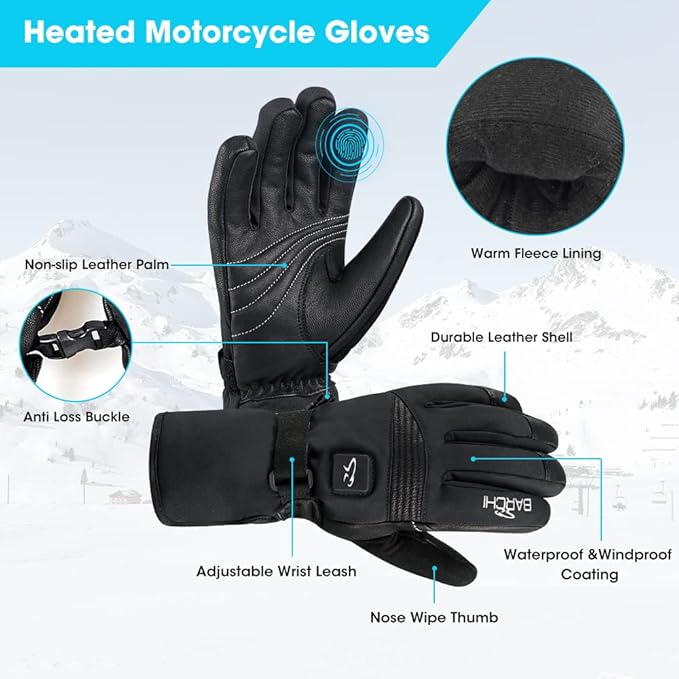 - ☀️[Touchscreen Design] Heated ski gloves designed the conductive touch screen on the index finger allows people with joint stiffness to type words without taking off winter gloves. Especially suitable for motorcycling, running, cycling, hiking, camping, climbing, skating, skiing, snowboarding, ice fishing, hunting, cleaning snow, walking dogs, etc.