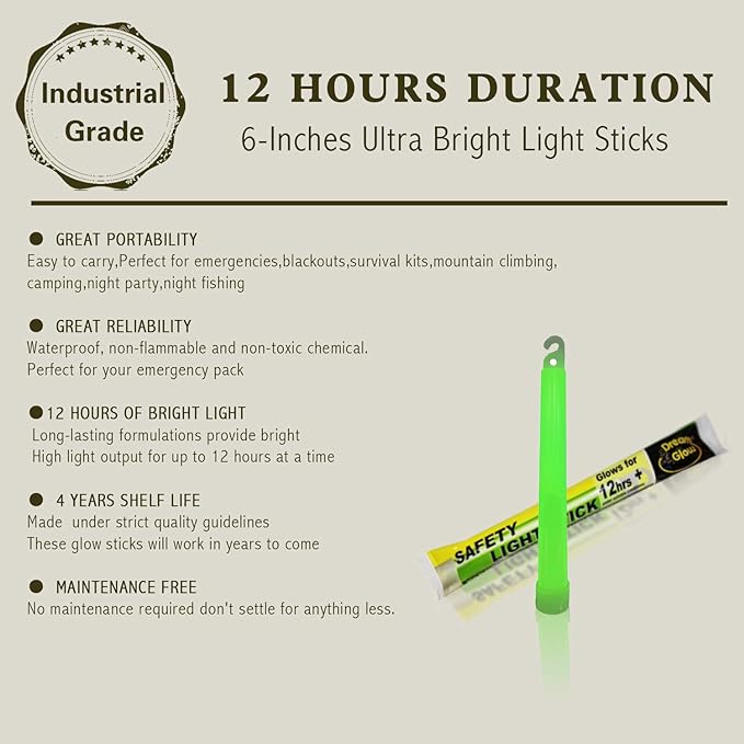 - LONG-LASTING LIGHT, MULTIPLE USES: PERFECT FOR EMERGENCIES, POWER OUTAGES, SURVIVAL KITS, CAMPING, DIVING, FISHING,HUNTING AND NIGHT'S PARTIES. The chem lights sticks keep illuminating your space for hours later. So whether you’re camping or diving, partying, or weathering a blackout, you’ll enjoy enough glow in the dark.