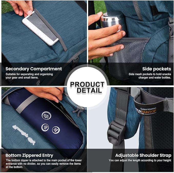 - Well-designed details: This outdoor backpack has many clever and convenient designs. The bottom compartment provides direct access to the main compartment; there is also a dedicated compartment for a water bladder (WATER BLADDER NOT INCLUDED), In addition, various shrink straps can also carry camping equipment such as trekking poles, sleeping bags and tents.