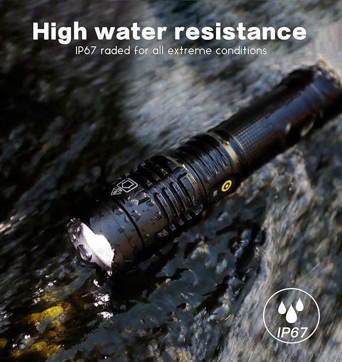 - ✔Aviation aluminum - Its durable military grade alloy body built for rough handling. IP67 rated waterproof and specially designed for using in heavy rain. Take this super bright flashlight set with you for protect yourself.