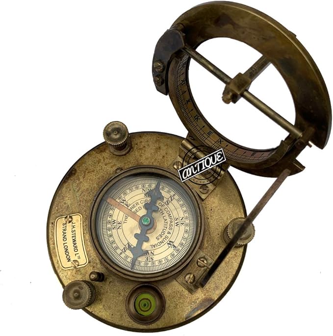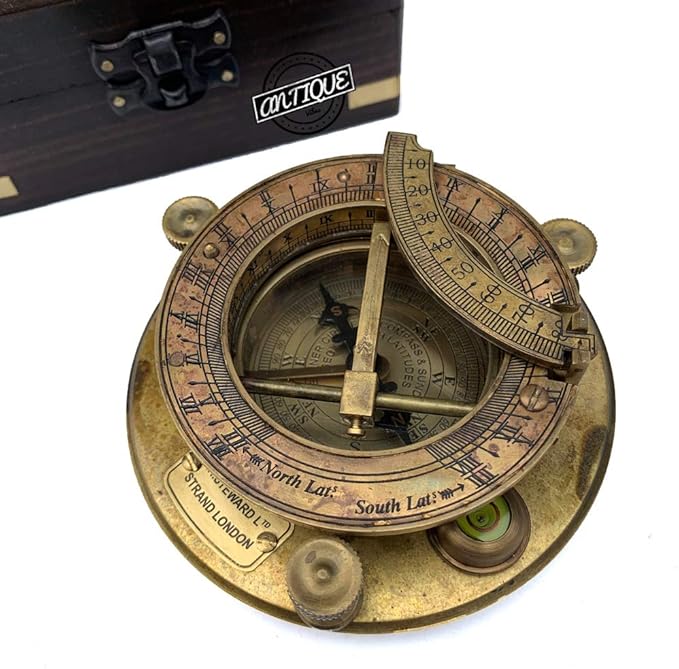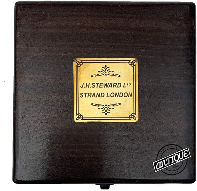 - Compass Size: 10 cm 4" inches Box Dimension: 12 x 12 x 6 cm Material: Brass & Wood Finish: Antique brass Weight: 500 grams with box Type: Magnetic Sundial Compass