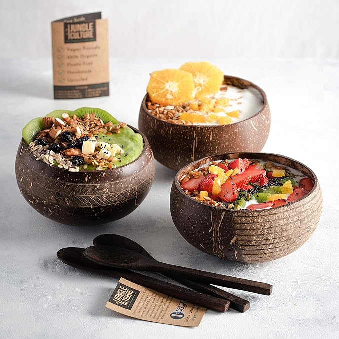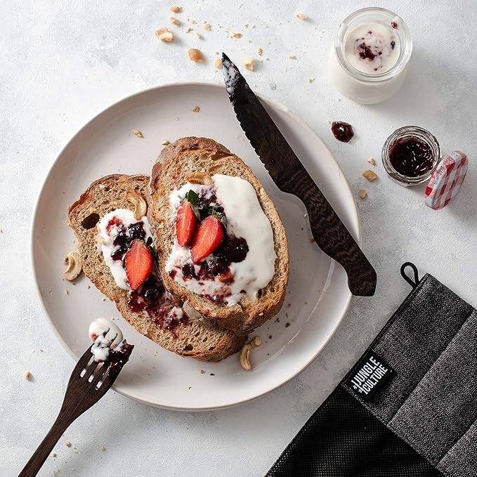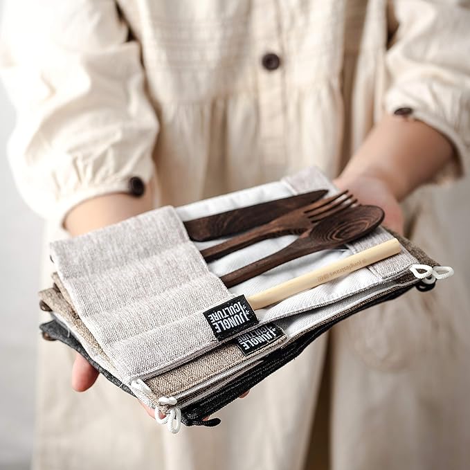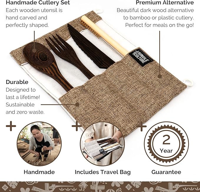 Jungle Culture® Premium Wooden Travel Utensils • Knife, Fork, Spoon, Straw, Case • Eco Friendly Alternative to Bamboo Cutlery • Coconut Bowls Zero Waste Reusable Flatware • Portable Camping Picnic Set
