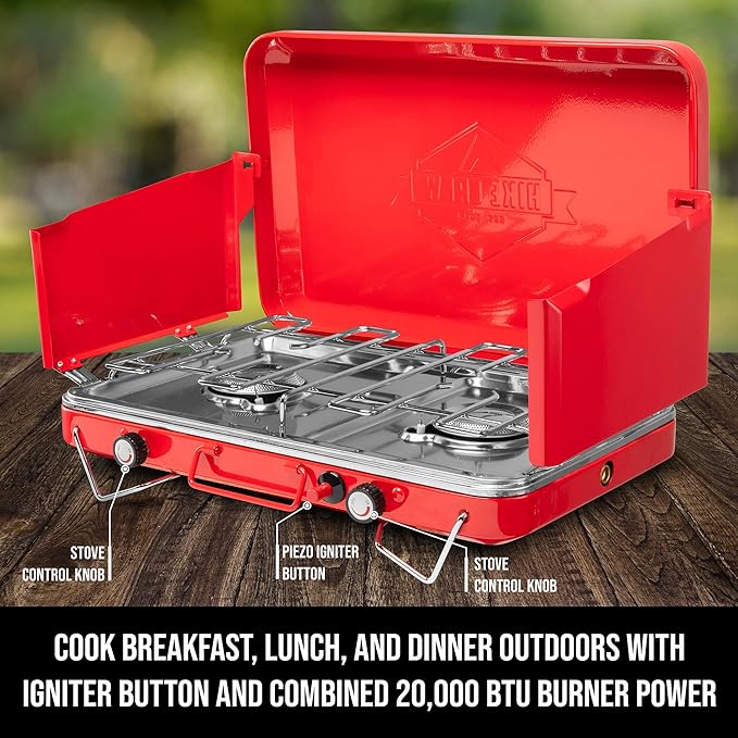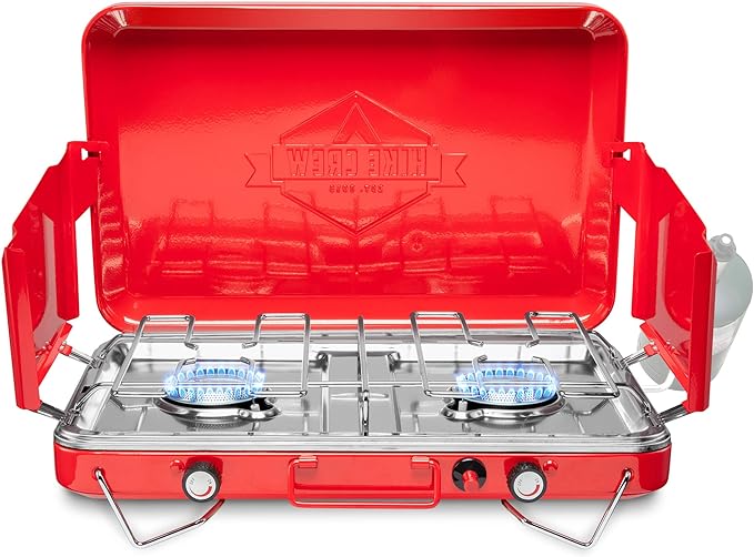 Hike Crew Gas Camping Stove | 20,000 BTU Portable Propane 2 Burner Stovetop | Integrated Igniter & Stainless Steel Drip Tray | Built-in Carrying Handle, Foldable Legs, Wind Panels | Includes Regulator