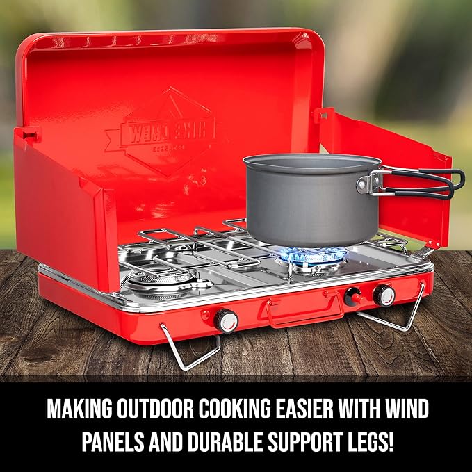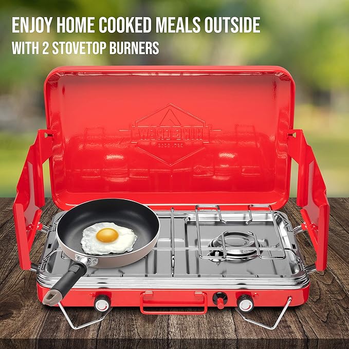 - COOK ANYTHING IN THE GREAT OUTDOORS | Powerful Propane-Powered Stovetop Features [2] 10,000 BTU Burners for Amazing Outdoor Cooking Convenience | Perfect for Preparing Steaks, Burgers, Chicken, Eggs, Bacon, Sausage, Pancakes, Coffee, Tea, Soup & Other Meals While Camping & More