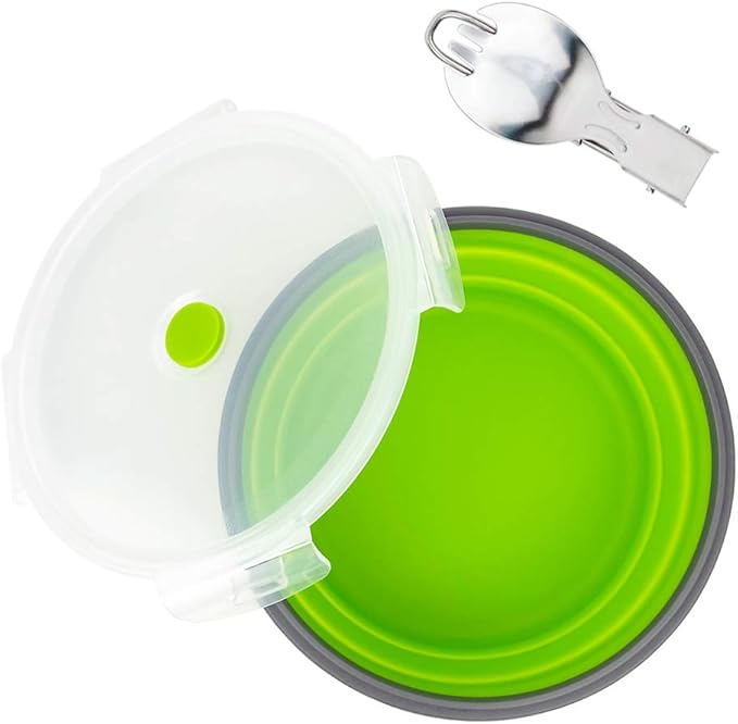 1200ml Collapsible Camping Bowl Silicone Food Storage Container with Lid and Foldable Stainless Steel Fork Spoon, for Picnic, Travel, Camping, RV, Fridge and Microwave Bowls