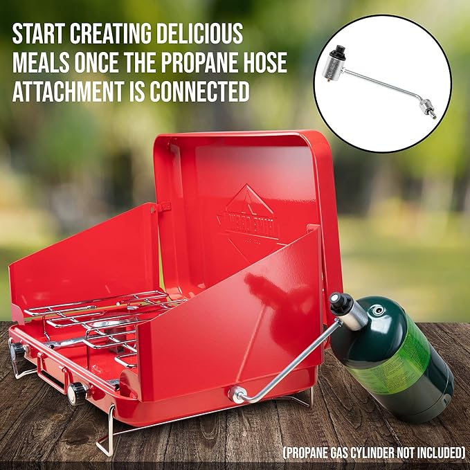 Hike Crew Gas Camping Stove | Portable Double Propane Burner | Built-in Carrying Handle, Foldable Legs & Wind Panels | Includes Regulator Tube