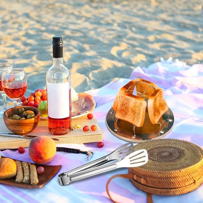 - What you get: you will get a camping toast set, including 1 pack camping stove toaster which can bake up to four slices at a time and 1 pack barbeque grill tongs