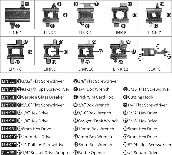 - 『MULTITOOL』29 in 1 outdoor emergency bracelet, A variety of box wrenches, hex wrench,hex drives, flat and Phillips screwdrivers, oxygen tank wrench, carbide glass breaker, sim card pick, cutting hook, socket drive adapter and bottle opener