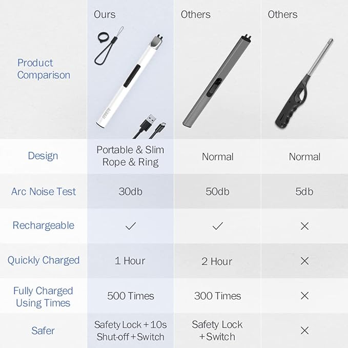 - 🎀【USB Rechargeable Lighter & Economical】USB candle lighter is equal to 300 disposable lighters, no butane, fluid, gas, flame. USB lighter reused more than 600 times. Easy to carry and can be charged by mobile power, computer, adapter. This would be a good option for an emergency kit ( like car lighter).