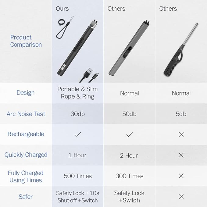 - 🎅【Electric Lighter & Safer】JEVSTU electric candle lighter uses plasma tech to replace harmful butane. Treble protection, you need to slide the safety lock and start the plasma arc beam. For safer, the electric lighter will shut off after 10s of being ignited. Note: It couldn't get to ignite while charging.