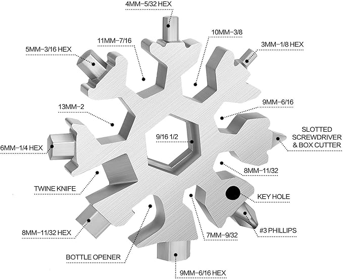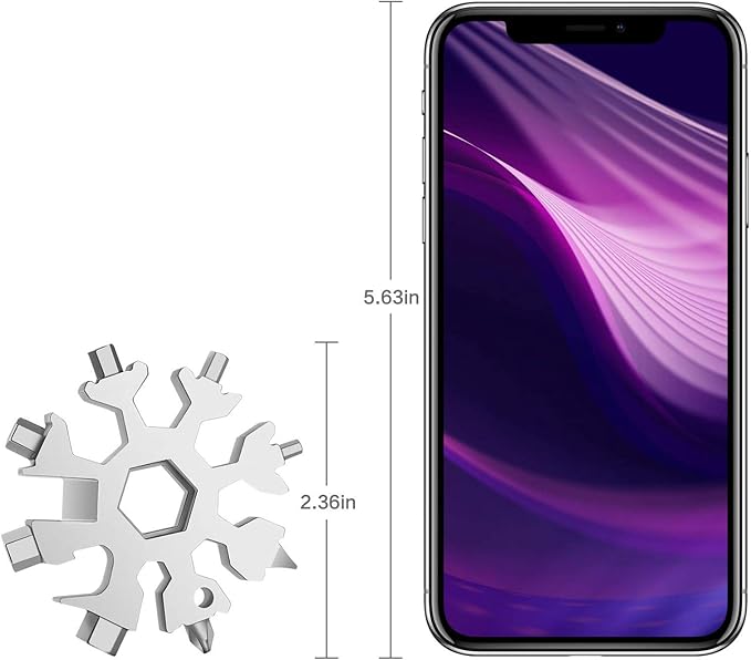 - Space Saver Multi Tool: The stocking stuffer snowflake multitool is small (2.3 " diameter) , but not too heavy (2.8 oz) connected to keychain or backpack with the included carabiners and keyrings. The 18 in 1 snowflake multitool can be used in travels, outdoor adventures, sports, camping, rescues...