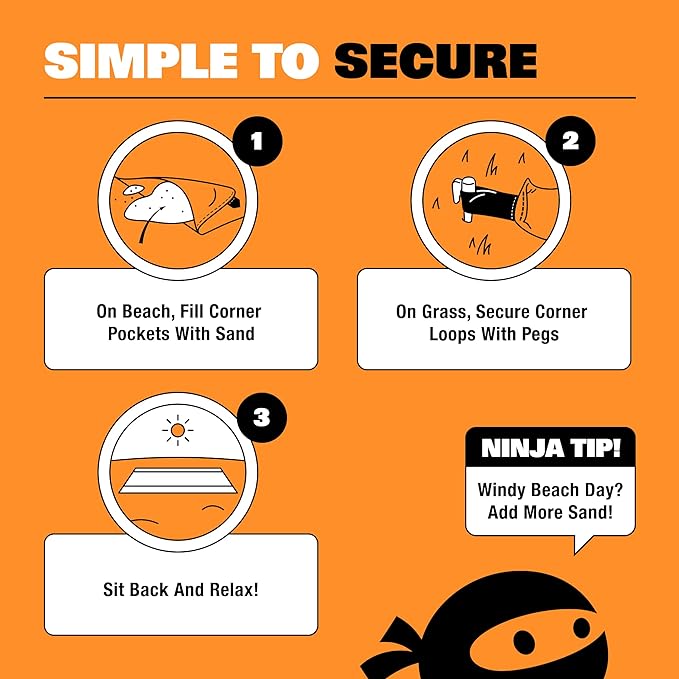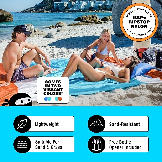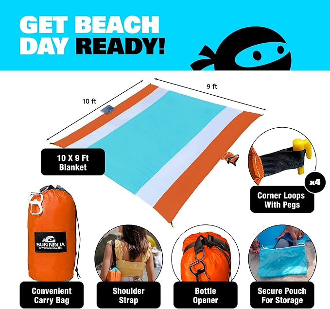 SUN NINJA Sand-Free Beach Blanket - 10ft X 9ft Lightweight Outdoor Blanket with Storage, Bottle Opener, Carabiner, Shoulder Strap, Corner Sand Pockets & 4 Stakes